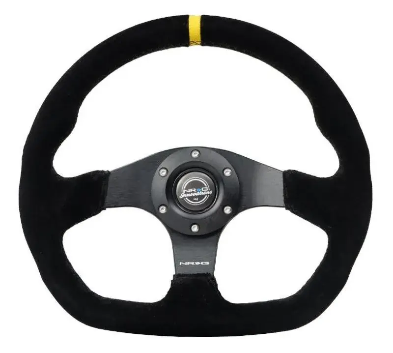 Buy Direct NRG NRG Reinforced Steering Wheel (320mm) Sport Suede Dual Push Buttons Flat Bottom w/ Yellow Center