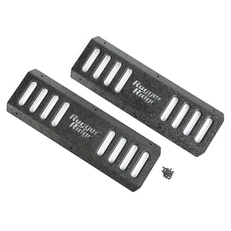 RRC Side Armor Step Plates are the perfect addition for your RRC Side Armor (11504.21). Constructed of tough stamped steel with a sturdy black textured powder coat finish, the Side Armor Step Plates give a solid platform to assist with vehicle entry that looks great and are engineered to last. With stylish recessed vents and the cutout Rugged Ridge logo, these step plates are as good looking as they are functional. Sold as a set of 2.