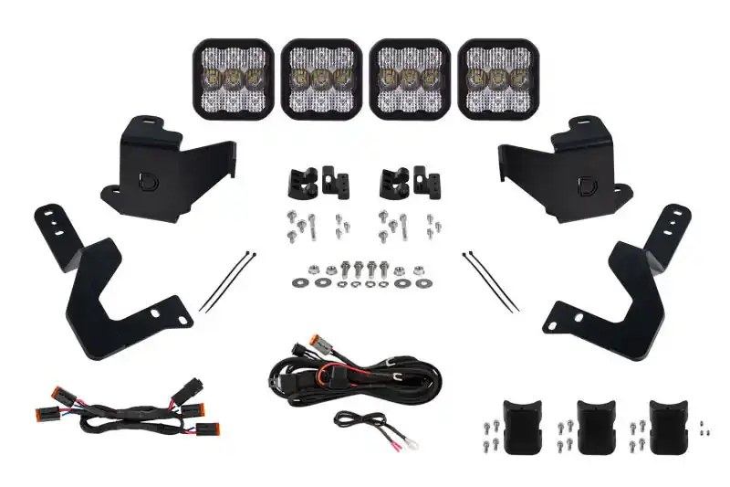 FeaturesBolt-on fitment compatible with Toyota Tundra 2022+. Allows you to mount a four-pod CrossLink lightbar across the grille. Ultra-high intensity, with custom-engineered TIR optics. Selectable backlight color, with eight color options. Torture-tested, heavy-duty construction. Utilizes existing mounting points for easy installation. Assembled in USAOverview Perfect Fitment. The Grille CrossLink Lightbar Kit compatible with Toyota Tundra 2022+ from Diode Dynamics allows you to mount four linked SS5 LED pods on the factory grille. These application-specific brackets were CAD-designed to bolt into place using factory mounting points on the bumper. No cutting or drilling required! Designed for Performance. Featuring the highest output intensity of any 5-inch LED pod on the market, these lamps have been designed for maximum functionality, with patented technology and custom-engineered TIR optics, all in a durable package. Selectable Backlight. The Stage Series 5inch LED Pods included in the White kit feature a selectable backlight with eight different color options, perfect for an extra styling accent that you won’t find on other LED pods. Selecting your backlight color is easy – simply alternate the power on and off. There’s no complicated programming with a controller! The SS5’s backlight fully illuminates the TIR optic. NOTE: The Yellow kit is only available with an Amber backlight color. CrossLink. Our patent-pending CrossLink technology allows you to link up to eight SS5 pods together to create your own lightbar. The single-piece CNC aluminum link provides extreme rigidity, but is fully adjustable, for both straight and curved configurations.