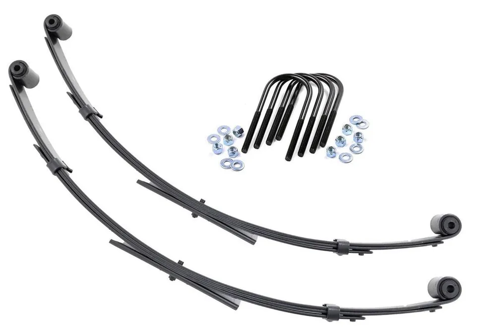 Durable and Off-Road Ready. Rough Country’s Replacement Leaf Springs are designed to tackle any terrain that they are faced with. Featuring a multi-leaf design and spring pads this reduces the friction and maximizes comfort. Each leaf pack utilizes tapered leaves for improved flexibility at their ends.