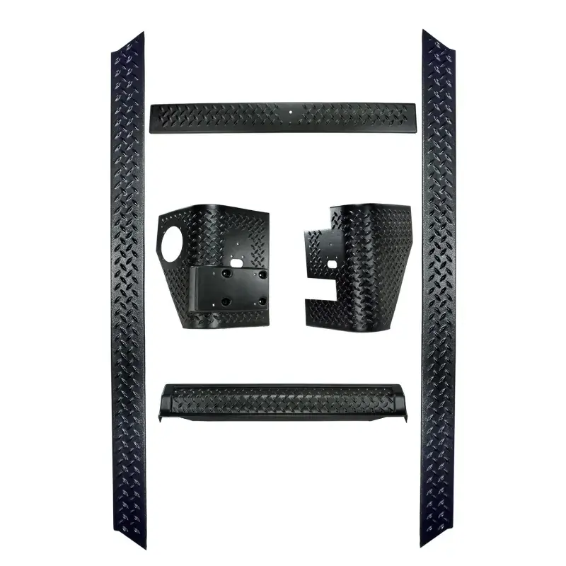 Get that off-road look with Rugged Ridge Body Armor! Each Body Armor piece is constructed of black diamond plate looking UV treated thermoplastic for the coolest, toughest looking up-grade for your Jeep. Each body armor attaches to your Jeep with ultra strong 3M tape to ensure a secure fit (front guard also may require some under hood drilling). Have a scratch or dent on your paint? Cover it up with body armor! Simply fill in the scratched area with touch-up paint (to prevent rust) and install the Body Armor. You have now repaired and upgraded! Includes Front Frame Cover, Rocker Side Cover Pair, Rear Corner Guard Pair, and Rear Tailgate Sill.